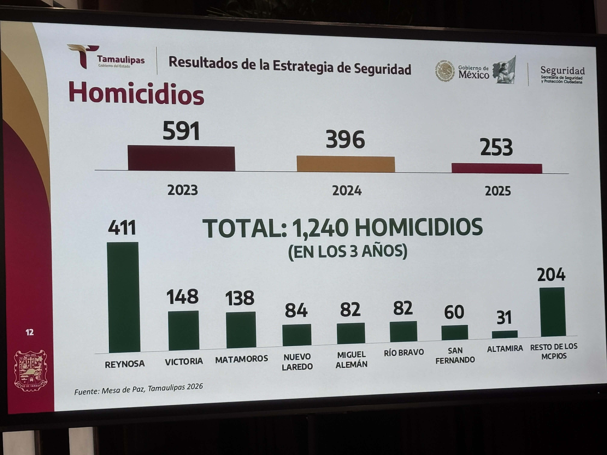 Ciudad Victoria, Tamaulipas, 20 de enero de 2026.-De acuerdo con la lámina presentada en el informe “Resultados de la Estrategia de Seguridad”, los municipios de Reynosa y Ciudad Victoria concentran el mayor número de homicidios dolosos registrados en Tamaulipas durante el periodo 2023–2025, con 411 y 148 casos, respectivamente.